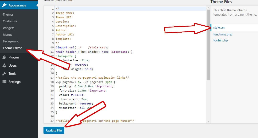 Choose “style.css” file from the right menu and after insert your CSS code. Click “Update file” to save your CSS code.